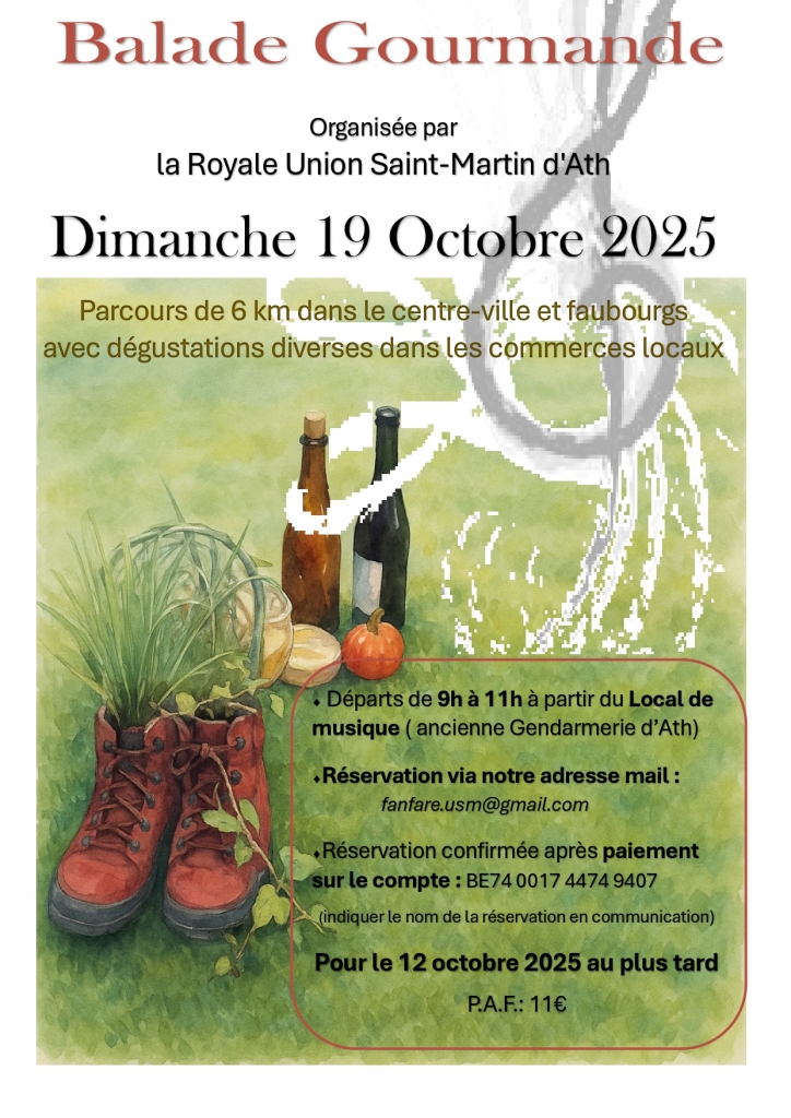 Réservation confirmée après paiement sur le compte bancaire : BE74 0017 4474 9407 avec la communication : Nom Prénom + Balade gourmande 2025