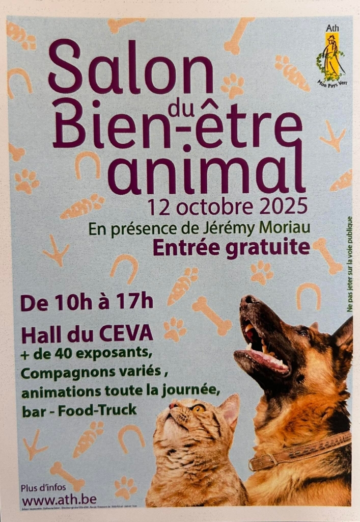 Allez partager la première édition du Salon du Bien-Être Animal athois qui aura lieu le dimanche 12 octobre 2025 de 10h à 18h au hall du CEVA, un dimanche pour mettre à l’honneur tous les animaux qui partagent nos vies.