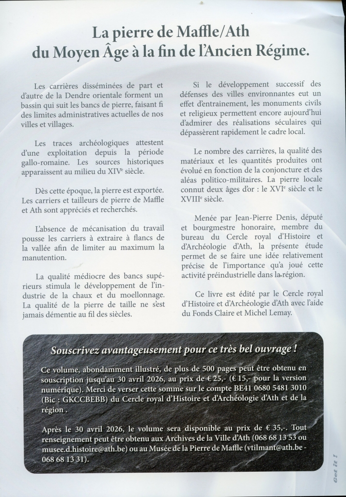 La souscription à cet ouvrage est ouverte jusqu’au 30 avril 2026 au prix de 25€ (ou 15€ pour la version électronique). Ce montant est à verser au compte BE41 0680 5481 3010 (Bic : GKCCBEBB). Information : Archives de la Ville d’Ath(musee.d.histoire@ath.be) ou Musée de la Pierre (vtilmant@ath.be).