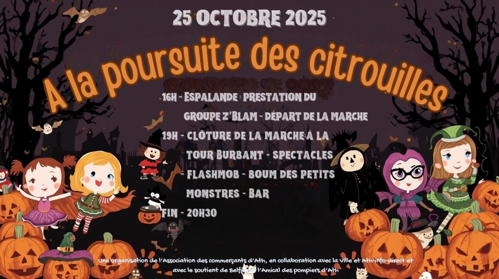 Balade-toi avec un adulte dans les rues du centre d'Ath et choisis tes 3 citrouilles préférées ! Les commerçants restent ouverts et t'offriront des bonbons !