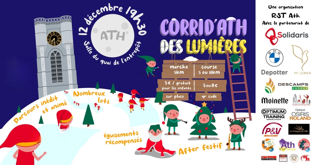 Le club RST ATH (Run & Smash Trail) est fier d’annoncer la quatrième édition de la Corrid’Ath des Lumières, qui se déroulera le vendredi 12 décembre. Après le succès de l’an passé, où plus de 1 500 participants ont arpenté notre parcours festif en courant ou en marchant, nous vous promettons une soirée encore plus lumineuse et conviviale !