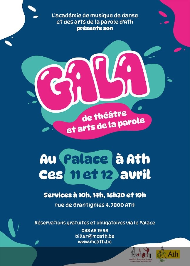 Les samedi 11 et dimanche 12 avril au Palace, l’Académie de Musique, de Danse et des Arts de la Parole d’Ath vous invite à son 1er Gala des Arts de la Parole.Au programme, quatre séances par journée : 10h, 14h, 16h30 et 19h.Entrée libre, placement libre. À travers une série de prestations variées, interprétations théâtrales, expression scénique et déclamations, les élèves des Arts de la Parole mettront en lumière toute la richesse et la créativité de leur discipline.Un moment privilégié pour découvrir la diversité des classes, du débutant au confirmé.Venez soutenir nos élèves et célébrer, avec eux, ce nouveau rendez-vous culturel dédié à la parole vivante.