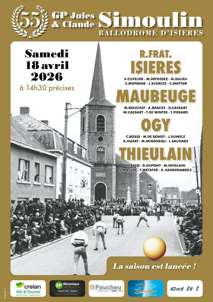 9h30 : Grand prix Montanari Bruno et Bougenies Patrice en pupillesThieulain - Oeudeghien - Ogy15 h GRAND PRIX HOTTONLes 4 équipes du H.O. en promotion qualifiées sont :Vaudignies - Isières - Ollignies - TourpesOrdre des rencontres :Vaudignies - IsièresOllignies - TourpesFinale entre les vainqueurs des deux éliminatoiresA partir de midi il sera possible de se restaurerApéritif, contre-filet - frites - crudités 20 €Apéritif, américain - frites - crudités 15 €Réservation obligatoire / 0478.62.29.21 Fabienne -