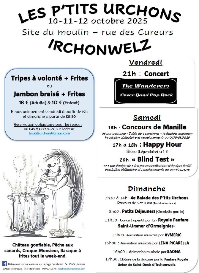 Le dimanche 12 octobre, dès 8h, omelettes garnies. De 7h30 à 14h, 4e balade des P’tits Urchons. Parcours de 5 et 11 km (participation 3 euros, incluant une boisson offerte). A 11h30, concert apéritif par la royale Fanfare Saint-Ursmer d’Ormeignies. Dès 12h30, tripes ou jambon braisé comme le vendredi soir (réservations obligatoires). A 13h, animation musicale par Aymeric, à 15h par Lena Picarella et à 16h par Saona.. Dès 17h30 clôture de la ducasse par la Fanfare royale Union de Saint-Denis d’Irchonwelz.