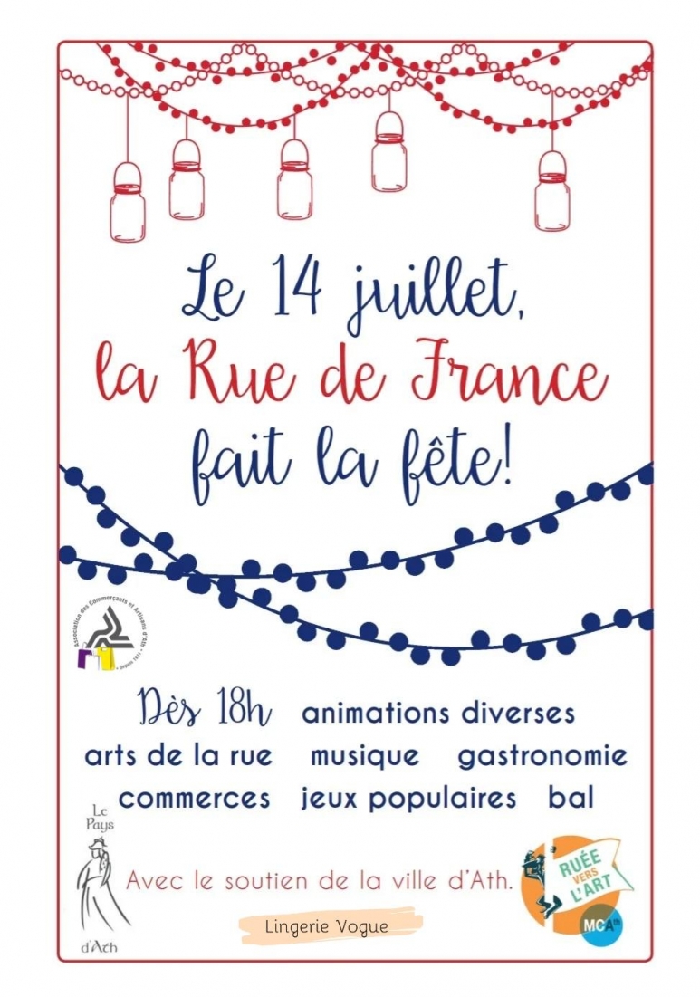 « Au départ alors que le CAR (le centre des arts de la rue) se trouvait à la rue France, nous voulions faire une fête du style fête des voisins et associer tous les habitants et les commerçants de cette rue », explique Alain Coulon l’un des organisateurs des festivités du 14 juillet à Ath. « Et c’est une commerçante qui a eu l’idée avec la rue de la France de fêter ce jour national français. C ’est ainsi qu’est née l’association des Amis du 14 juillet. » Conclut Alain