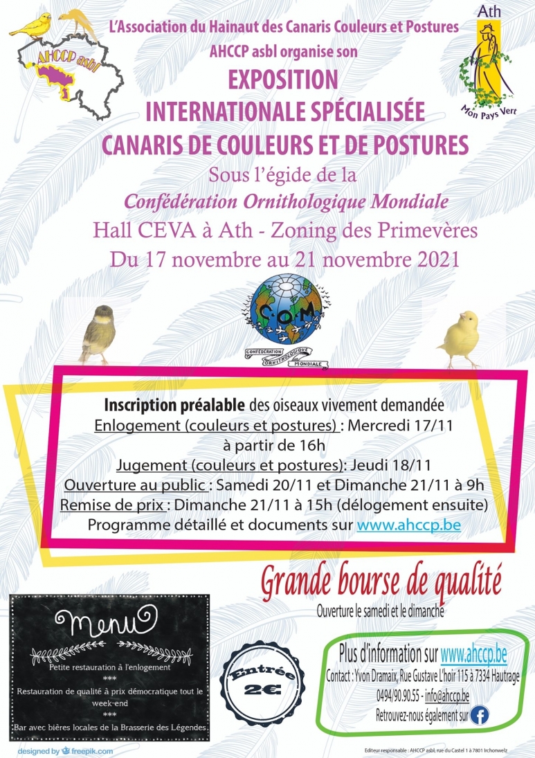 L'Association du Hainaut des Canaris Couleurs et Postures organise un grand show et exposition « canaris de couleurs et de postures » à la salle du CEVA à Ath du 17 au 21 novembre 2021.