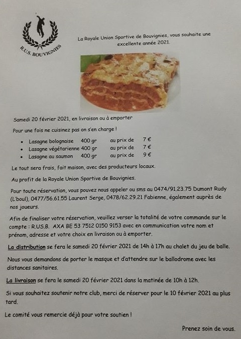 Bouvignies: La RUSB propose des lasagnes à emporter!