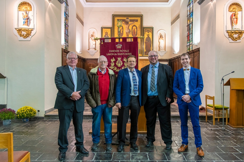Ce dimanche 9 novembre, lors du Concert de Ste Cécile en l'église d'Irchonwelz, près de 50 années de direction musicale réunies sur cette photo. La Royale Fanfare l'Union de Saint Denis d'Irchonwelz peut être fière de ses 5 derniers Chefs : Philippe Quittelier (1978-1984), Jean-Marie Pierot (1984-2000), Laurent Rasmont (2000-2015), Damien Stiévenart (2015-2025) et Thibaut Seghers (2025-...) qui a pris ses fonctions officiellement ce dimanche.